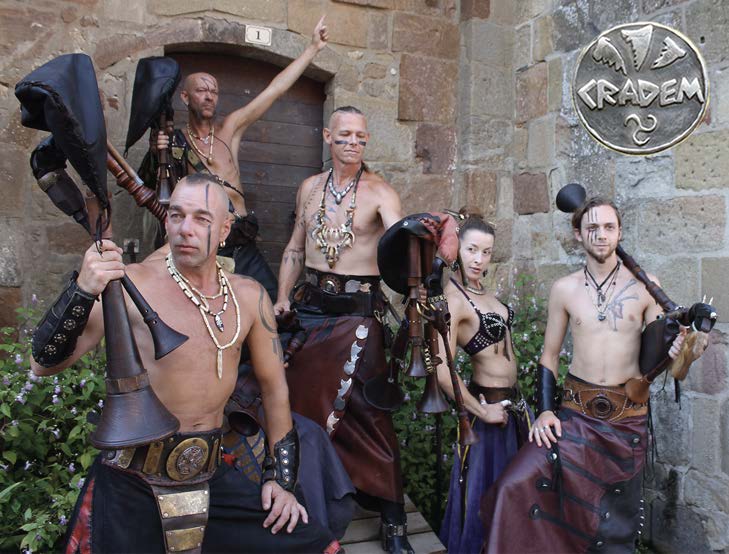 CRADEM AVENTURE – so nennt sich die fünfköpfige Band, die mit einem brachialen Bühnenprogramm und bisher 4 veröffentlichten Silberscheiben auch außerhalb deutscher Landen eine wachsende Zahl an Fans verzeichnet. Ihre Musik ist eine Mischung aus traditionellem nordischem Liedgut, Einflüssen der Moderne und ein bisschen Fantasy. Die Götter müssen den Musikern von CRADEM wohl gesonnen sein, denn seit nunmehr 25 Jahren ziehen sie mit ihrer Musik erfolgreich durch Europa und erfreuen das Volk mit ihren ostgotischen Melodien. Drei Dudelsäcke, ein Schlagwerk, eine Harpa, ein Schlagbass sowie mehrere gar merkwürdig anzuschauende Instrumente sind ihre Arbeitsutensilien, mit denen sie es trefflichst verstehen , auch mehrstimmige Lieder vorzutragen. Ihr Aussehen und ihre Kostüme sind sehr martialisch, wobei sie alles andere als kriegerisch sind, denn wer sich traut, kann sehr anregende und nette Gespräche mit ihnen führen. Und auch das haben Shadan, Carlos, Sebastian, Arazon, Salvador und Zarina gemeinsam: ihren Nachnamen von Berkano. So ist es auch nicht verwunderlich, dass man bei ihren Auftritten die Harmonie untereinander spüren kann, so, wie es eben in einer Familie sein soll.